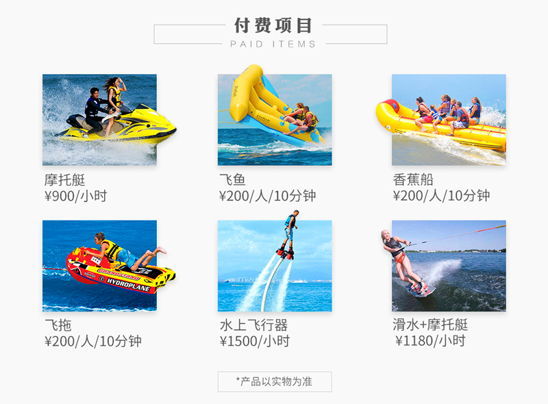 選配項目: 摩托艇、飛魚、香蕉船、水上飛行器、飛拖、滑板